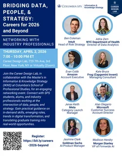 Join the Career Design Lab, in collaboration with the Master's in Information & Knowledge Strategy (IKNS) at Columbia's School of Professional Studies, for an engaging networking event. Connect with SPS students, alums, and industry professionals working at the intersection of data, people, and strategy. Gain practical guidance on in‑demand skills, emerging roles, trends in digital transformation, and translating graduate training into real‑world opportunities.