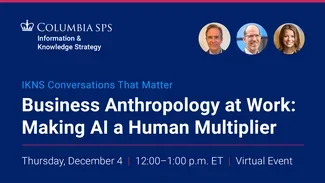 Rooted in the perspective of the new Business Anthropology course in Columbia’s MS in Information & Knowledge Strategy (IKNS), this event explores how people, culture, and technology shape organizational life and how AI can become a human multiplier rather than a force that widens disconnects. In an era in which the sheer amount of information often grows faster than our understanding of it, Business Anthropology offers leaders the tools to see context clearly, listen across differences, and avoid costly blind spots.