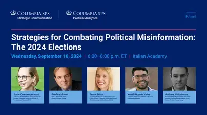 As we approach the 2024 US elections, political misinformation remains critically important. Building on the discussions from last fall, the M.S. in Strategic Communication and M.S. in Political Analytics programs are hosting a follow-up panel. This event will delve deeper into the factors that influence the spread and impact of misinformation on beliefs and explore strategies for effectively combating it. Our panel features leading experts in strategic communication, public opinion research, political psychology, and media, providing valuable insights and practical approaches to address this pressing issue.