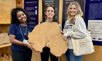 Current SUSCI student Camryn Louder (left), SUSCI alumna Olivia Colton (center), and SUSCI alumna Chandler Precht (right) posing with a tree core at the LDEO open house.